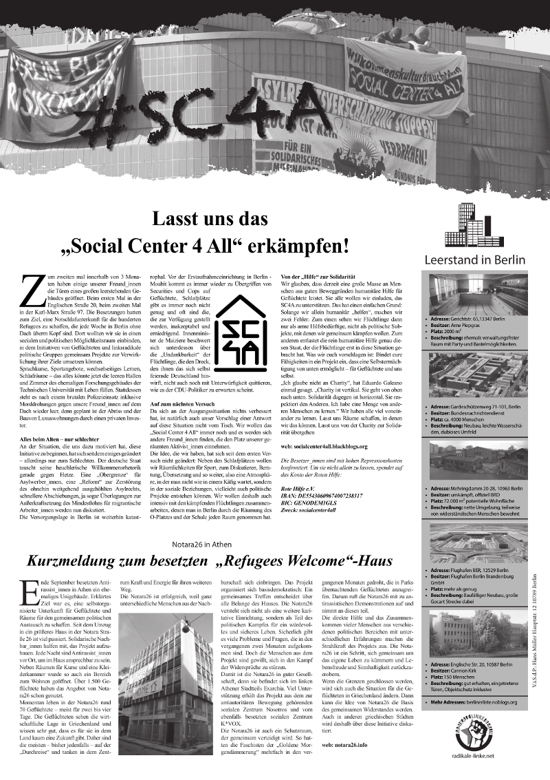 Ob an Bushaltestellen, vor der Kaufhalle oder einfach am Eck. Überall finden sich öffentliche Orte an denen das gesellschaftliche Leben in den Kiezen stattfindet. Nach unseren Wandzeitungen zu Fluchtursachen und für ein soziales Zentrum widmen wir diese Ausgabe der Idee und der Notwendigkeit eines Social Centers für alle. In diesem Jahr hatte es in Berlin bereits zwei Versuche gegeben, ein Haus zu besetzten.